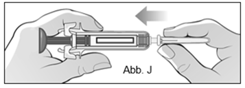 Setzen Sie die Nadel auf die Spritze, indem Sie sie fest in einer geraden Linie auf die Spritze drücken und leicht drehen (Abb. J).