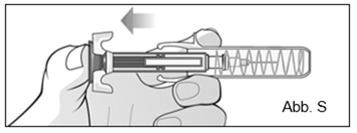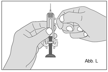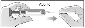 Halten Sie mit einer Hand die Spritze in der Mitte des Spritzenkörpers fest und ziehen Sie mit der anderen Hand den Nadelschutz in einer geraden Linie ab. Werfen Sie den Nadelschutz in den durchstichsicheren Behälter (Abb. K). ·Nachdem Sie den Nadelschutz entfernt haben, dürfen Sie die Nadel nicht berühren und die Nadel auch nichts berühren lassen, da die Nadel dadurch verunreinigt werden könnte und bei Berührung Verletzungen und Schmerzen verursachen kann. ·Eventuell sehen Sie am Ende der Nadel einen Tropfen Flüssigkeit. Das ist normal. ·Bringen Sie den Nadelschutz auf keinen Fall wieder an, nachdem Sie ihn einmal abgenommen haben.