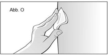 Reinigen Sie den Bereich an der ausgewählten Injektionsstelle mit einem Alkoholtupfer, um das Infektionsrisiko zu verringern. Befolgen Sie dabei sorgfältig die Hinweise zur Anwendung des Alkoholtupfers (Abb. O). ·Lassen Sie die Haut etwa 10 Sekunden trocknen. ·Achten Sie darauf, den gereinigten Bereich vor der Injektion nicht zu berühren. Befächern Sie den sauberen Bereich nicht und blasen Sie nicht darauf. ·Entsorgen Sie den Alkoholtupfer umgehend nach der Anwendung.