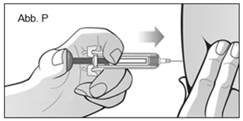 Damit die Nadel richtig unter die Haut gestochen werden kann, kneifen Sie mit Ihrer freien Hand an der sauberen Injektionsstelle die Haut zwischen Daumen und Fingern zusammen, so dass sich eine Hautfalte bildet. Das Zusammenkneifen der Haut ist wichtig um sicherzustellen, dass Sie lediglich unter die Haut (in das Fettgewebe) und nicht tiefer (in das Muskelgewebe) spritzen. Eine Injektion in den Muskel kann zu einer unangenehmen Injektion führen (Abb. P). Stechen Sie die Nadel in einem Winkel von 90 Grad in einer schnellen, pfeilartigen Bewegung vollständig in die Haut ein. Halten Sie dann die Spritze fest und lassen Sie die zusammengekniffene Hautfalte los. Bewegen Sie die Nadel nicht, während sie in die Haut eingeführt ist.