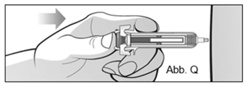 Nachdem Sie die Nadel vollständig in die Haut eingeführt haben, drücken Sie den Kolben langsam mit dem Daumen, während Sie die Spritze mit Zeigefinger und Mittelfinger gegen die Fingerauflage drücken, bis das gesamte Arzneimittel injiziert ist. Der Kolben sollte vollständig nach vorne gedrückt sein und Sie sollten ein Klicken hören, das die Aktivierung der Nadelsicherheitsvorrichtung anzeigt (Abb. Q).