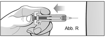 Lassen Sie den Kolben nicht los, bevor die Injektion beendet ist oder Sie den Kolben nicht ganz nach vorne eingedrückt haben. Ziehen Sie die Nadel aus der Haut, OHNE den Kolben loszulassen (Abb. R).