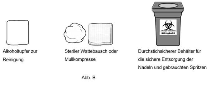 Nach der Injektion: ·Legen Sie einen sterilen Wattebausch oder eine sterile Mullkompresse auf die Injektionsstelle und drücken Sie einige Sekunden lang darauf. Entsorgen Sie den Wattebausch bzw. die Mullkompresse umgehend nach der Anwendung. ·Reiben Sie nicht mit einer schmutzigen Hand oder einem schmutzigen Tuch an der Injektionsstelle. ·Falls erforderlich, können Sie ein kleines Pflaster auf der Injektionsstelle anbringen. Entsorgung der Spritze: ·Werfen Sie gebrauchte Spritzen in einen durchstichsicheren Behälter. ·Versuchen Sie nicht, den Nadelschutz wieder an der Nadel anzubringen. ·Werfen Sie die benutzte Spritze mit der Nadel oder den durchstichsicheren Behälter nicht in den Hausmüll. ·Entsorgen Sie den vollen durchstichsicheren Behälter gemäss den örtlichen Vorschriften oder nach den Angaben Ihrer medizinischen oder pharmazeutischen Ansprechperson.
