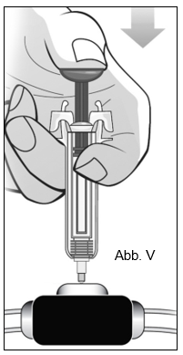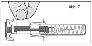Drücken Sie den Kolben mit dem Daumen, während Sie die Spritze mit Zeige- und Mittelfinger festhalten, bis das gesamte Arzneimittel injiziert ist (Abb. V). Entfernen Sie die Fertigspritze vom Venenzugang OHNE den Kolben los zu lassen. Lassen Sie dann den Kolben los, wodurch die Nadelsicherheitsvorrichtung die Nadel verdeckt. Nun kann gegebenenfalls, das Abziehetikett entfernt werden (Abb. T).