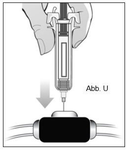 Setzen Sie die Nadel der Fertigspritze auf den gereinigten Venenzugang (Abb. U). Berühren Sie nicht die Injektionsstelle des Venenzugangs.