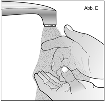 Desinfizieren Sie Ihre Hände gut mit Seife und warmem Wasser oder einem Händedesinfektionsmittel (Abb. E).