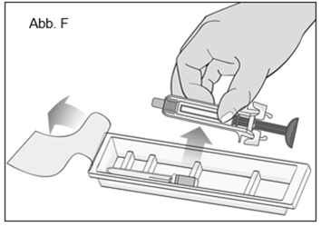 Ziehen Sie die Schutzfolie von der Kunststoffschale ab und nehmen Sie die darin enthaltene Nadel und die Spritze heraus. Fassen Sie die Spritze in der Mitte des Hauptteils an, ohne die Aktivierungssicherungen zu berühren (Abb. F). Fassen Sie die Spritze nur am Hauptteil an, da jede Berührung der Aktivierungssicherungen dazu führen könnte, dass die Sicherheitsvorrichtung vorzeitig gelöst wird.
