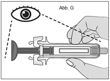 Untersuchen Sie die Spritze auf Beschädigungen und überprüfen Sie das mit «EXP» bezeichnete Verfallsdatum auf der Spritze und der Schachtel. Dies ist wichtig zur sicheren Verwendung der Spritze und des Arzneimittels (Abb. G). Verwenden Sie die Spritze nicht, wenn: ·Sie die Spritze versehentlich fallen gelassen haben. ·ein Teil der Spritze beschädigt zu sein scheint. ·der Inhalt wolkig oder trüb ist oder Schwebstoffe enthält. ·das Verfalldatum abgelaufen ist.