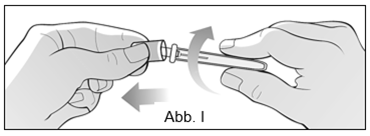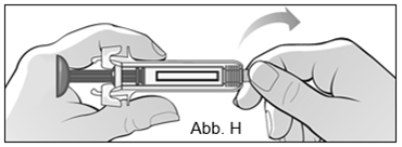 Halten Sie mit einer Hand die Spritze in der Mitte des Spritzenkörpers und mit der anderen Hand die Gummischutzkappe und ziehen Sie die Gummischutzkappe fest von der Spritze ab (biegen und abziehen) (Abb. H). ·Werfen Sie die Gummispitze nach dem Abnehmen sofort in den durchstichsicheren Behälter. ·Berühren Sie nicht die Aktivierungssicherungen. ·Drücken Sie nicht den Kolben. ·Ziehen Sie nicht am Kolben.