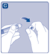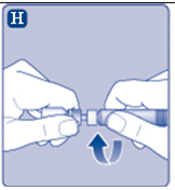 ·Entfernen Sie die Spritzenkappe von der Fertigspritze, indem Sie sie nach unten biegen, bis die Perforation bricht. Berühren Sie nicht die Spritzenspitze unter der Spritzenkappe. Wenn Sie die Spritzenspitze berühren, können Keime von Ihren Fingern übertragen werden. Verwenden Sie die Fertigspritze nicht, wenn die Spritzenkappe locker ist oder fehlt.