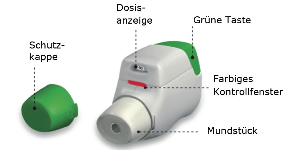 Schritt 1 – Drücken Sie die grüne Taste herunter und lassen Sie sie anschliessend wieder los; atmen Sie vollständig aus, aber nicht in den Inhalator.