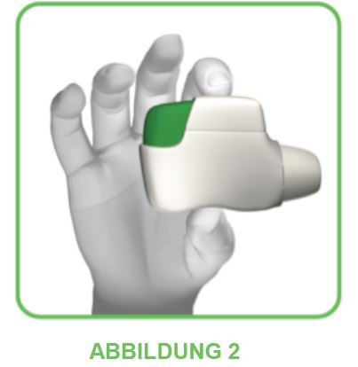 SCHRITT 1: Drücken Sie die grüne Taste herunter und lassen Sie sie anschliessend wieder los; atmen Sie vollständig aus, aber nicht in den Inhalator.