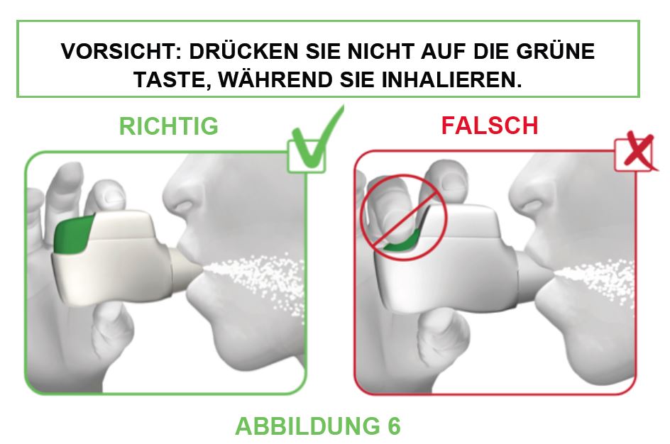 ·Bevor Sie den Inhalator an Ihren Mund führen, atmen Sie bitte vollständig aus. Atmen Sie nicht in den Inhalator aus.