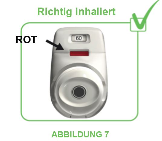 ·Prüfen Sie, ob die Farbe des Kontrollfensters von grün zu rot gewechselt hat (siehe Abbildung 7). Der Farbwechsel zeigt an, dass Sie die volle Dosis korrekt inhaliert haben.