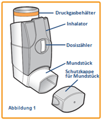 Lesen Sie diese Packungsbeilage vor der Anwendung sehr aufmerksam durch und befolgen Sie die Anwendungshinweise in dem folgenden Text und den Abbildungen. Ihr Arzt oder Apotheker bzw. Ihre Ärztin oder Apothekerin wird Ihnen zeigen, wie Sie den Inhalator richtig anwenden. Das Arzneimittel befindet sich in einem Druckgasbehälter (siehe Abbildung 1), der in einem Inhalator aus Kunststoff steckt. Das Plastikgehäuse hat einen Dosiszähler, der Ihnen anzeigt, wie viele Sprühstösse verbleiben, nachdem Sie den Inhalator für den Gebrauch vorbereitet haben. Die Dosisanzeige hat eine Farbkodierung, die mit Grün beginnt, graduell auf Gelb wechselt, sobald weniger als 50 Sprühstösse verbleiben, und graduell auf Rot wechselt, wenn weniger als 30 Sprühstösse verbleiben. Die Dosisanzeige zeigt die Anzahl der verbleibenden Sprühstösse zunächst in Zehnerschritten (120 bis 60 verbleibende Sprühstösse), dann in Fünferschritten (ab 60 verbleibenden Sprühstössen) an. Wenn diese Anzeige gegen null geht, müssen Sie Ihren Arzt bzw. Ihre Ärztin aufsuchen, damit er bzw. sie Ihnen einen neuen Inhalator verordnet. Verwenden Sie den Inhalator nicht mehr, wenn der Dosiszähler eine «Null» anzeigt.