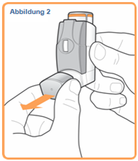 2. Der Inhalator sollte unmittelbar vor Freisetzen eines Hubs (Sprühstosses) jedes Mal geschüttelt werden, um sicherzustellen, dass der Inhalt des Inhalators gleichmässig verteilt ist.