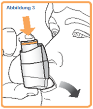 5. Atmen Sie langsam und tief durch den Mund ein (siehe Abbildung 3). Drücken Sie mit Beginn der Einatmung von oben auf den Druckgasbehälter, um einen Hub (Sprühstoss) freizusetzen. Atmen Sie weiter gleichmässig und tief ein (am besten etwa 4 bis 5 Sekunden lang).