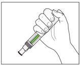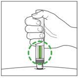 8. Abschluss der Injektion: ·Warten Sie das zweite Klicken ab. Dieses zeigt an, dass die Injektion nahezu abgeschlossen ist. ·Vergewissern Sie sich, dass der grüne Indikator das Sichtfenster ausfüllt und sich nicht mehr bewegt. ·Der Fertigpen kann jetzt entfernt werden.