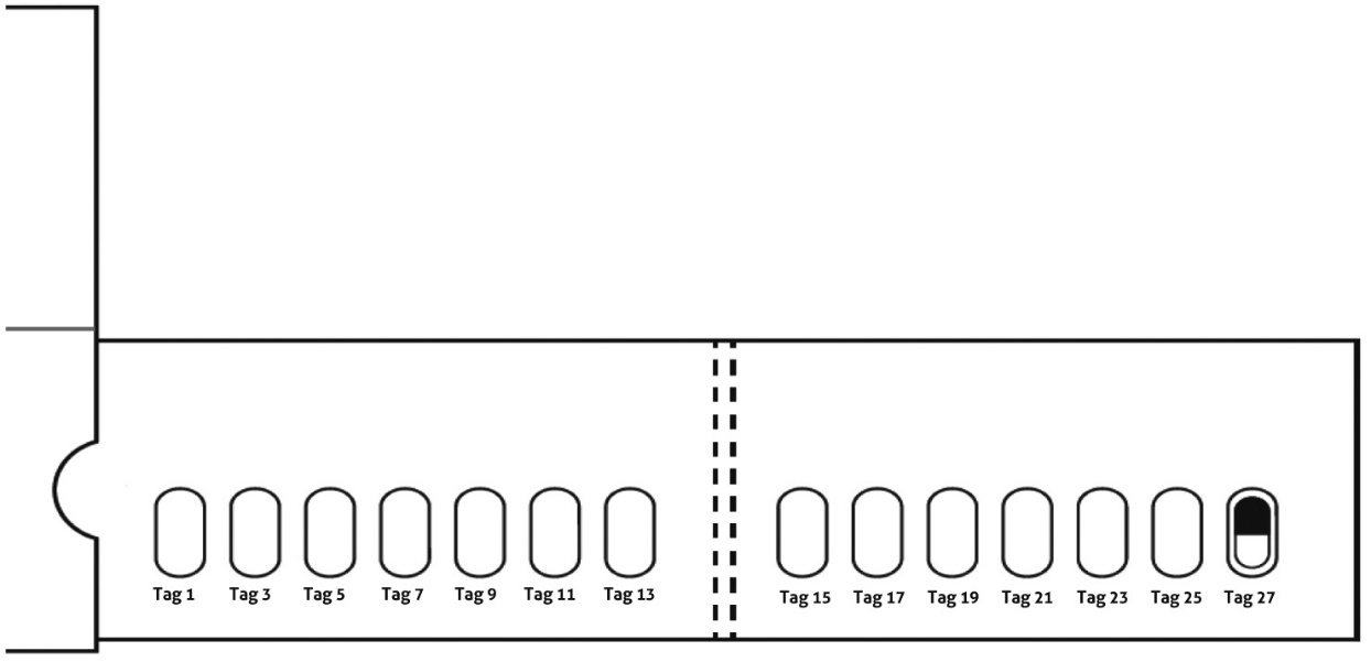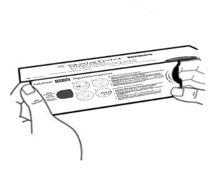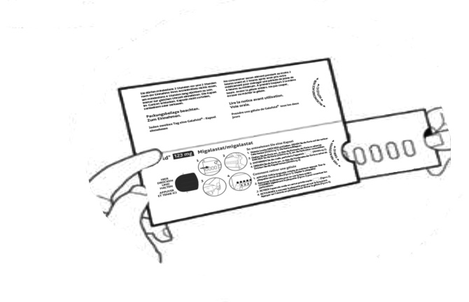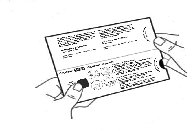 Nehmen Sie 1 Galafold-Kapsel an jedem zweiten Tag ein. Schliessen Sie die Packung und bewahren Sie sie für die nächste Anwendung auf. Abbildung H – Vorderseite der aufgeklappten Blisterkarte