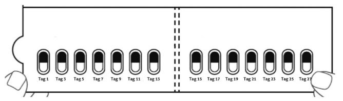Schritt 3: GREIFEN Sie die Lasche auf der rechten Seite, wo „HIER HERAUSZIEHEN“ steht, und ziehen Sie die gefaltete Blisterkarte heraus (siehe Abbildung C).