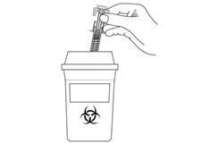 Werfen Sie die gebrauchte Fertigspritze in einen Spritzenbehälter (verschliessbarer durchstichsicherer Behälter). Kanülen und gebrauchte Spritzen dürfen nicht wiederverwendet werden.