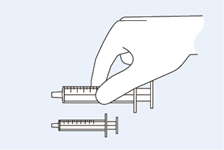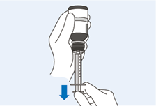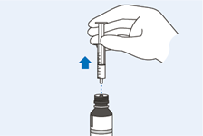 23. Halten Sie die Spritze im Flaschenadapter fest und ziehen Sie den Kolben langsam zurück bis Sie die erforderliche Menge an Suspension aufgezogen haben. Das obere Ende des Kolbens befindet sich dabei in einer Linie mit der Volumenmarkierung an der Spritze.