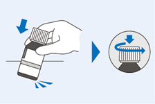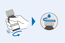 19. Drücken Sie zum Öffnen der Flasche den Deckel nach unten und drehen Sie ihn in Pfeilrichtung. Bewahren Sie den Deckel auf, um die Flasche nach dem Gebrauch wieder zu verschliessen.