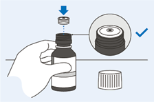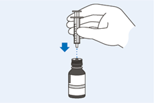 Hinweis: Wenn Sie nicht die richtige Menge aufgezogen haben oder wenn sich in der Spritze grosse Luftblasen befinden, führen Sie die Spritze noch einmal in den Flaschenadapter ein, drücken Sie das Arzneimittel aus der Spritze für die orale Verabreichung (Dispenser) zurück in die Flasche und ziehen Sie es dann erneut auf (beginnen Sie bei Schritt 22).
