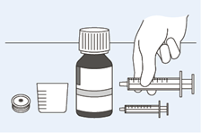 17. Wählen Sie die Spritze für die orale Verabreichung (Dispenser) dem Dosisvolumen entsprechend aus. Wenn die Dosis 11 ml oder mehr beträgt, erfordert dies zwei Arzneimittelentnahmen aus der Flasche. Wenn beim zweiten Mal weniger als 3 ml zu entnehmen sind, verwenden Sie dazu die kleine Spritze für die orale Verabreichung (Dispenser).
