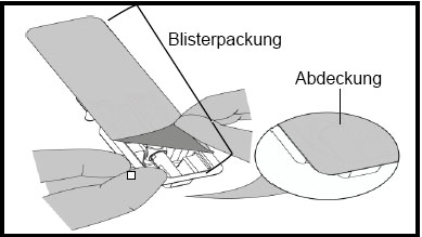 Warnung/Vorsichtsmassnahme: Vergewissern Sie sich, dass sich in der Packung kein loses Fragment oder Flüssigkeit befinden. Öffnen Sie im Zweifelsfall diese Packung NICHT und nehmen Sie stattdessen eine andere Packung. Öffnen Sie die Blisterpackung, indem Sie die Abdeckung wie abgebildet ganz von der Blisterpackung abziehen.