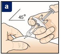 Stechen Sie die Nadel im Winkel von 45 Grad vollständig in die zusammengedrückte Hautfalte ein. Versuchen Sie nicht, die Position der Fertigspritze nach dem Einstechen in die Haut zu verändern.