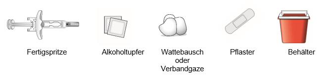 ·1 TEZSPIRE Fertigspritze aus dem Kühlschrank ·1 Alkoholtupfer ·1 Wattebausch oder Verbandgaze ·1 kleines Pflaster (optional) ·1 durchstichsicherer Behälter. Hinweise zur sicheren Entsorgung der gebrauchten TEZSPIRE Fertigspritze siehe Schritt 10.