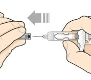 Entfernen Sie die Nadelhülle erst, wenn Sie zur Injektion bereit sind. Halten Sie den Spritzenkörper mit einer Hand und ziehen Sie die Nadelhülle mit der anderen Hand gerade ab. Halten Sie die Spritze nicht am Kolben oder Kolbenkopf, während Sie die Nadelhülle abziehen. Legen Sie die Nadelhülle zur späteren Entsorgung beiseite. Eventuell sehen Sie einen Tropfen Flüssigkeit an der Spitze der Nadel. Das ist normal. Berühren Sie die Nadel nicht und vermeiden Sie jeden Kontakt der Nadel mit einer Oberfläche. Setzen Sie die Nadelhülle nicht wieder auf.