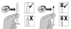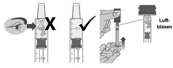 1.7: Überprüfen Sie die Spritze auf Luftblasen. Wenn Sie Luftblasen sehen, drücken Sie den Kolben ganz durch, so dass das Arzneimittel in die Flasche zurückfliesst, und entnehmen anschliessend erneut die verschriebene Dosis (siehe Abbildung L).