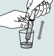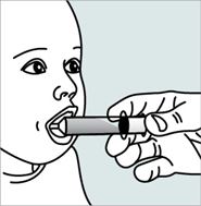 Schritt 4: ·Platzieren Sie die Spitze der Applikationsspritze vorne im Mund des Kindes zwischen Zunge und Wangeninnenseite und drücken Sie dann vorsichtig den Kolben herunter, um die Mischung aus Flüssigkeit und Pellets zwischen die Zunge und die Wangeninnenseite Ihres Kindes zu spritzen. Spritzen Sie die Mischung aus Flüssigkeit und Pellets nicht in den hinteren Rachenraum des Kindes, da dies zu Würgen oder Verschlucken führen könnte. ·Wenn ein Rest der Mischung aus Flüssigkeit und Pellets in dem Mischgefäss verbleibt, wiederholen Sie die Schritte 3 und 4, bis die gesamte Dosis gegeben wurde.