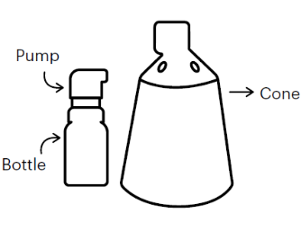 ·1 Flasche (entsprechend 180 Sprühstössen) mit Spraypumpe und 1 separaten Konus (B).