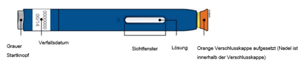 14.Nach der Injektion: Entsorgen Sie den benutzten Fertigpen und die weisse bzw. orangefarbene Kappe. Geben Sie den benutzten Fertigpen sofort nach dem Gebrauch in einen durchstichsicheren Entsorgungsbehälter. Werfen Sie den Fertigpen nicht in den Hausmüll. Der Fertigpen ist nur zum einmaligen Gebrauch bestimmt und darf nicht wiederverwendet werden.