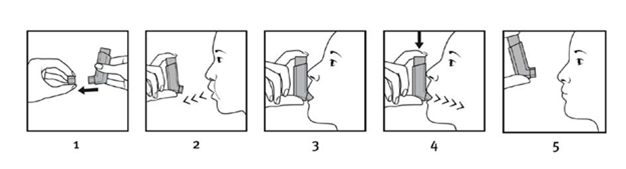 4.Atmen Sie langsam und tief durch den Mund ein, bis die Lunge gefüllt ist (dies sollte etwa 4-5 Sekunden dauern). Drücken Sie unmittelbar, nachdem Sie mit dem Einatmen begonnen haben, fest auf den oberen Teil des Druckbehältnisses, um einen Sprühstoss freizusetzen.